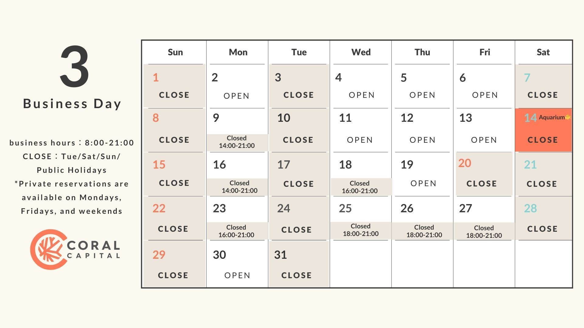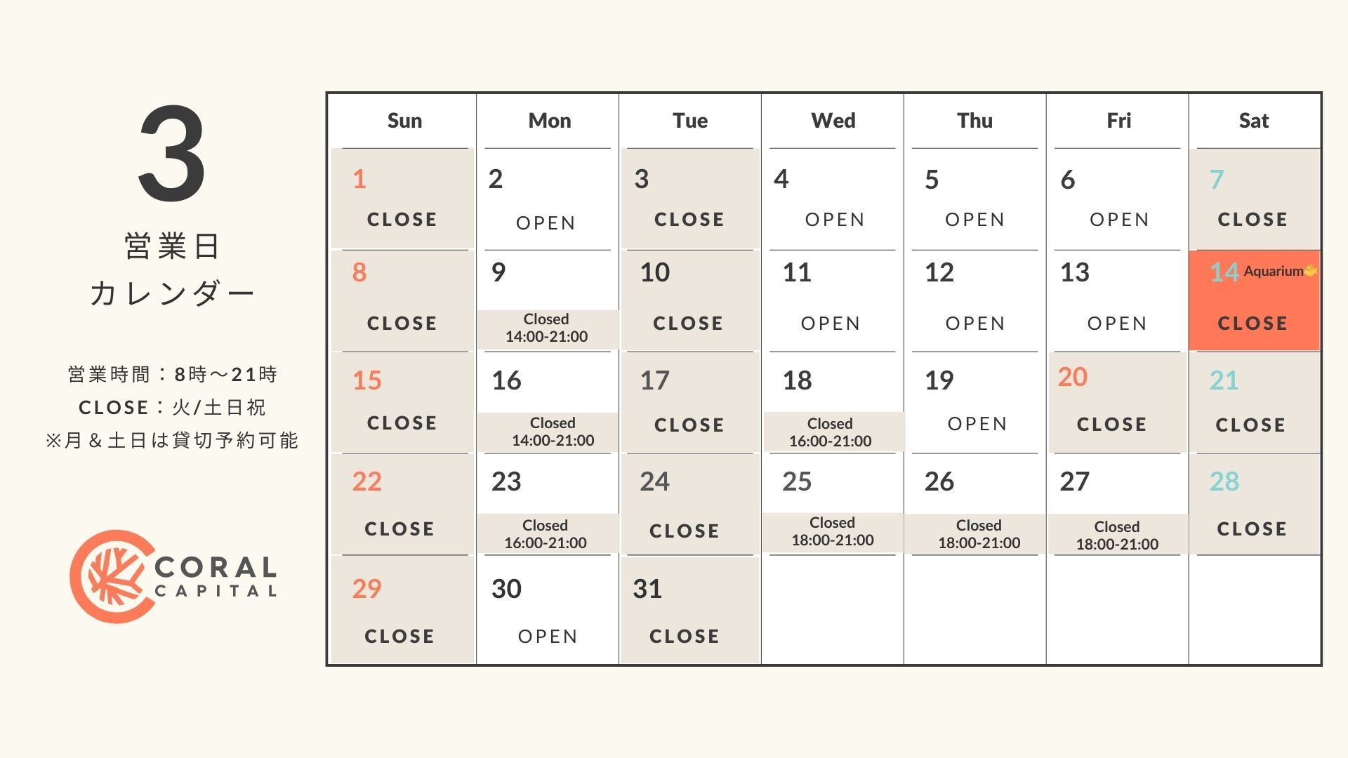 ⚠️3月はAquarium関連イベントが多いため一部時間帯のCLOSEが多くなっております!